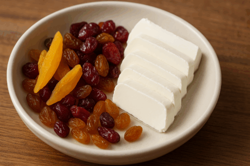 ドライフルーツとチーズを並べるだけ。はちみつ少量もあり。